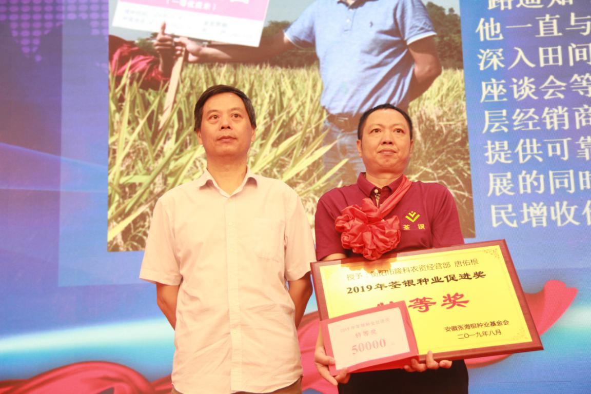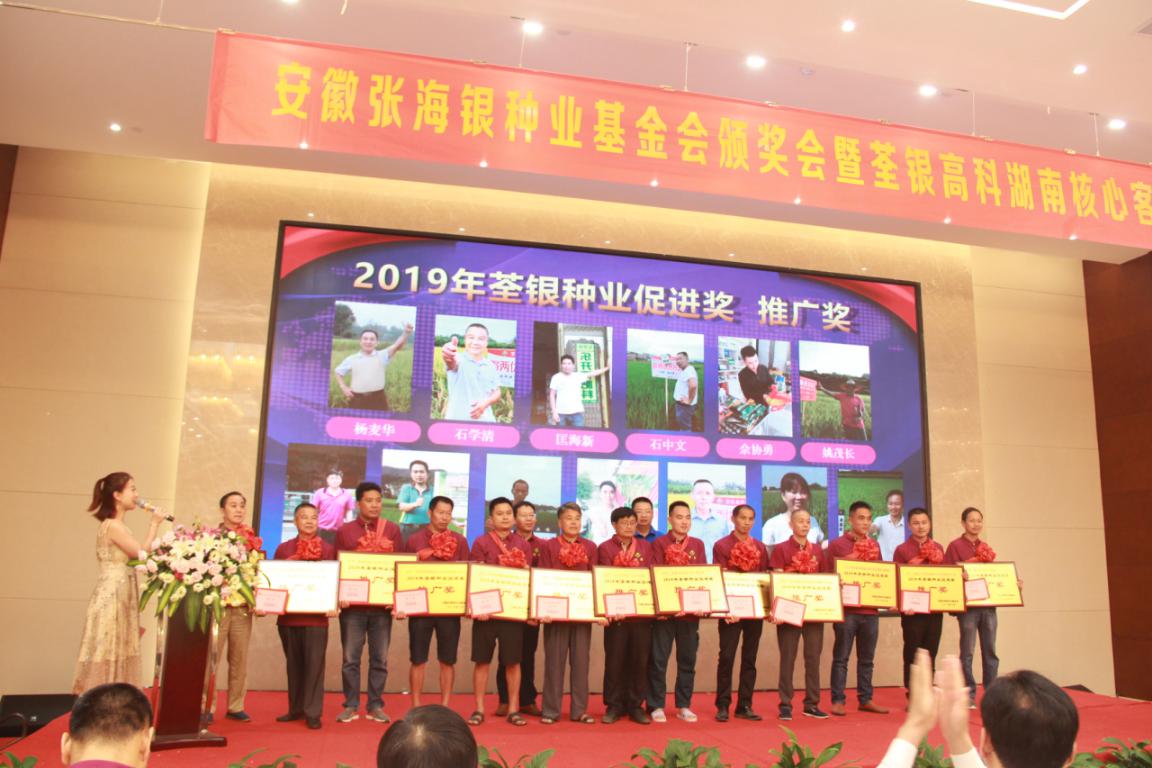 ?? ?隨后,張海銀種業(yè)基金會(huì)鄭滿生監(jiān)事宣讀了張海銀種業(yè)基金會(huì)“荃銀種業(yè)促進(jìn)獎(jiǎng)”2019年頒獎(jiǎng)決定文件。大會(huì)向38名在優(yōu)質(zhì)水稻推廣和良種服務(wù)等方面取得優(yōu)異成績(jī)的個(gè)人頒發(fā)了“荃銀種業(yè)促進(jìn)獎(jiǎng)”專項(xiàng)獎(jiǎng)。